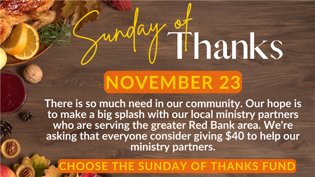 Let's share our blessings with those in need in our community! You can give at the link below by selecting the “Sunday of Thanks” fund, or write "Sunday of Thanks" in the memo of a check.